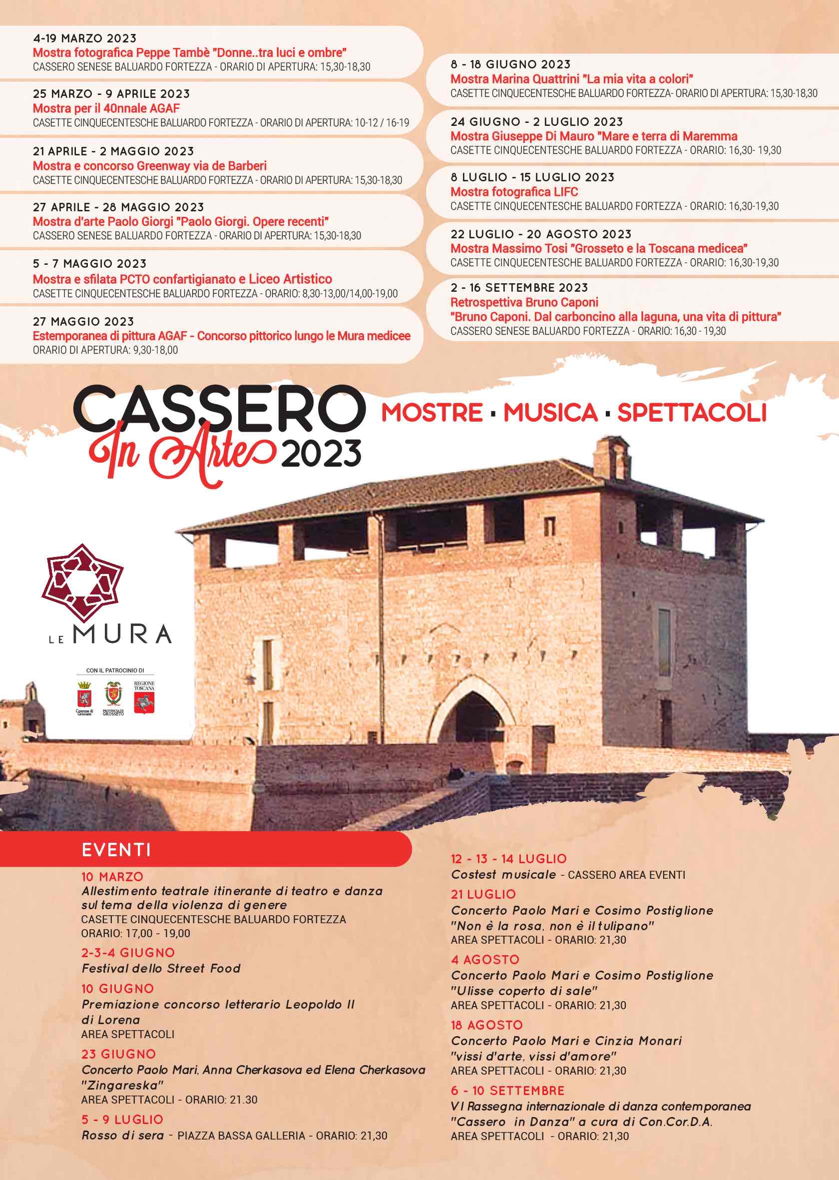La rassegna apre i battenti sabato 4 marzo con l’inaugurazione della mostra del fotografo ritrattista nisseno Peppe Tambè "Donne… tra luci e ombre" che resterà aperta al pubblico fino al 19 marzo. Dal 25 marzo al 9 aprile, invece, presso le Casette cinquecentesche si terrà la mostra collettiva che celebra il 40esimo anniversario della Fondazione AGAF. Saranno esposte le opere di pittori, scultori e grafici che dal 1982 al 2022 hanno partecipato attivamente alle iniziative d’arte dell’associazione, punto di riferimento per gli artisti del territorio grossetano. AGAF tornerà poi ad essere protagonista il 27 maggio con una estemporanea di pittura che coinvolgerà l'intera cinta muraria e riserverà molte sorprese. Dal 27 aprile al 28 maggio, invece, i visitatori potranno apprezzare nell’area espositiva del Cassero senese, la mostra di Paolo Giorgi, uno tra i più illustri artisti del panorama nazionale del nostro tempo. L’esposizione "Paolo Giorgi. Opere recenti" è il fiore all’occhiello della rassegna ed in essa si celebra il simbolismo realistico di Giorgi che nasce dalla sua fascinazione per il mito e le fiabe. Giugno sarà il mese dedicato alle mostre di Marina Quattrini "La mia vita a colori" (8-18 giugno) e Giuseppe Di Mauro "Mare e terra di Maremma" (24 giugno-2 luglio) entrambe previste presso le Casette cinquecentesche del Baluardo Fortezza. L’esposizione di Giuseppe Di Mauro sarà arricchita da alcune sue poesie bucoliche ispirate all’incontro tra uomo e natura, che si fonderanno con le sue sculture, per la maggior parte create a partire da ciò che l'artista recupera nelle sue passeggiate sulle spiagge e nella macchia mediterranea. Dal 1 all'8 luglio sarà la volta della mostra fotografica "Attraversare Aleppo. La città e il suo territorio ieri e oggi", organizzata dal Dipartimento di Storia, Geografia, Arte e Spettacolo dell'Università di Firenze.